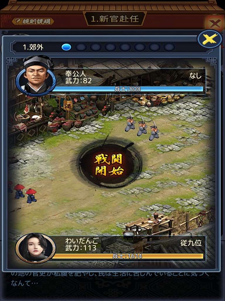 次に関所へ行くよう勧められます。悪さをする奴らがのさばっているので、戦闘で退治しましょう。戦闘開始を押すと自動で終わるまで戦ってくれます。兵士の数も重要ですが、相手より武力が上回っていないと、相手の兵士と同等以上の兵士を消耗してしまうので、関所へ行くつもりならせめて相手と同等の武力を目指しましょう。