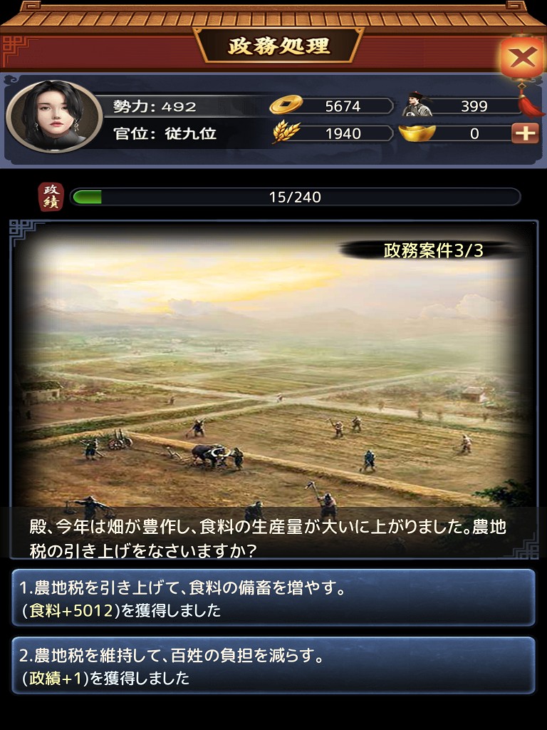 このゲームの目的は勢力を増やすことですが、官吏としての執務を忘れてはいけません。それが勢力の拡大へ繋がります。政務・経営・関所、この3つがゲームで行うことになる基本的なことです。政務は民の間で起きた出来事を2択でどう処理するかでもらえる報酬が変わってきます。