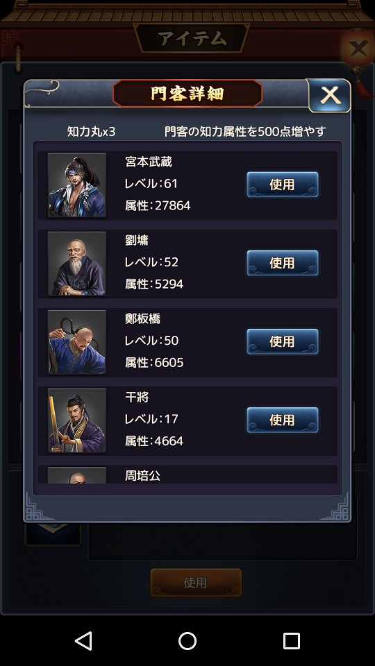勢力は門客全ての属性総合値で決まります。属性は昇級することで上がっていきますが、値としては小さめです。しかも銀錠を使い、レベルによっては10万を超える額を要求してくるため、そのうち気軽にできなくなってくるでしょう。ですから昇級に詰まったら属性を上げるアイテムである「属性丸」を使いましょう。属性を上げるアイテムは何種類かに分かれていて、指定して上昇するものやランダム指定のものがあります。なかには値を5,000上昇させるものもあるため、手に入ったら積極的に使ってください。