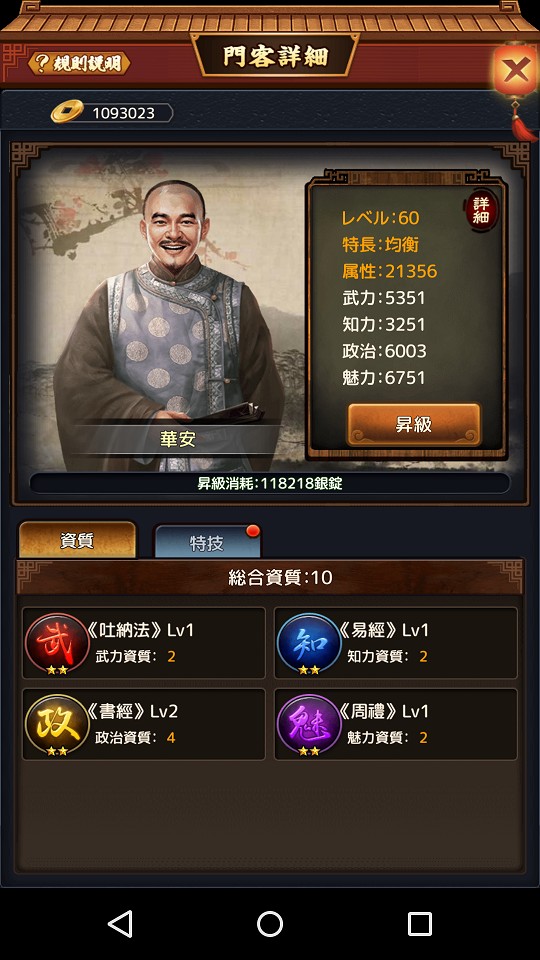 華安はゲームを始めて最初に門客になってくれるキャラクターであり、プレイヤーの経営を補佐してくれる重要なキャラクターです。華安の属性傾向は「均衡」で昇級すると全ての数値が偏りなく上昇します。資質も少ないし事前情報を知らないで遊んだ人は大抵パッとしない印象を受けるのではないでしょうか。