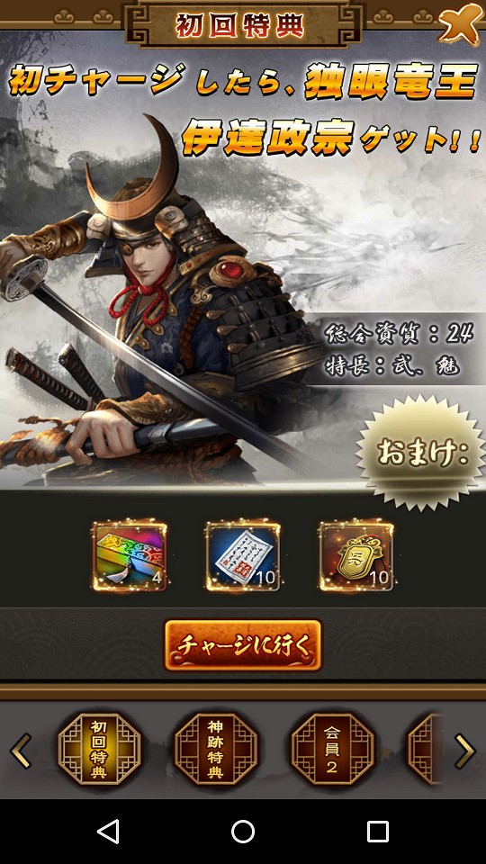 初回チャージ特典で門客の伊達政宗がついてきます。門客はいて困るものではありませんし、120円ならジュース1本我慢するだけです。コストにしては属性値の伸びも良く、長い間役に立ってくれるでしょう。もちろんいなくてゲームに詰まるといったことはないので、課金するかどうかはあなたの自由です。