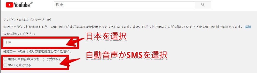 国のタブから「日本」を表示し、電話の自動音声メッセージかSMSを選び、自分の電話番号を入力します。