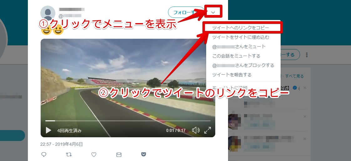 まずは保存したい動画が添付されているツイートをブラウザで開きましょう。ツイートの右上からメニューを表示し、続けて「ツイートのリンクをコピー」をクリックします。