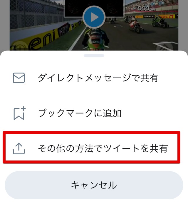 まずは「Twitter」アプリを開き、保存したい動画の詳細メニューから「その他の方法でツイートを共有」へと進みます。