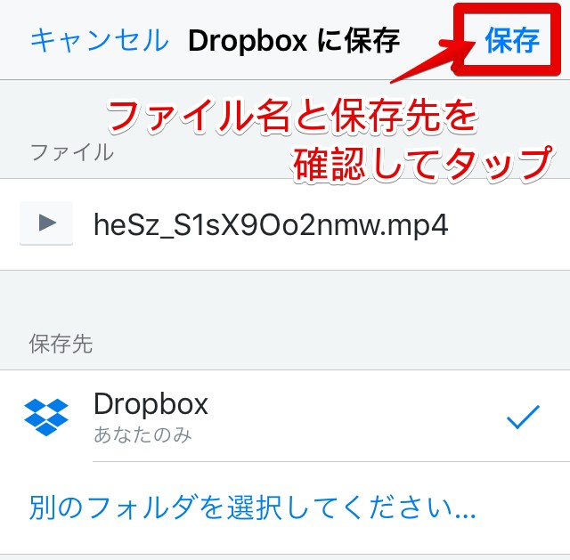 「Dropbox」に動画を保存します。動画ファイル名と保存先のフォルダは好みで変更可能です。
