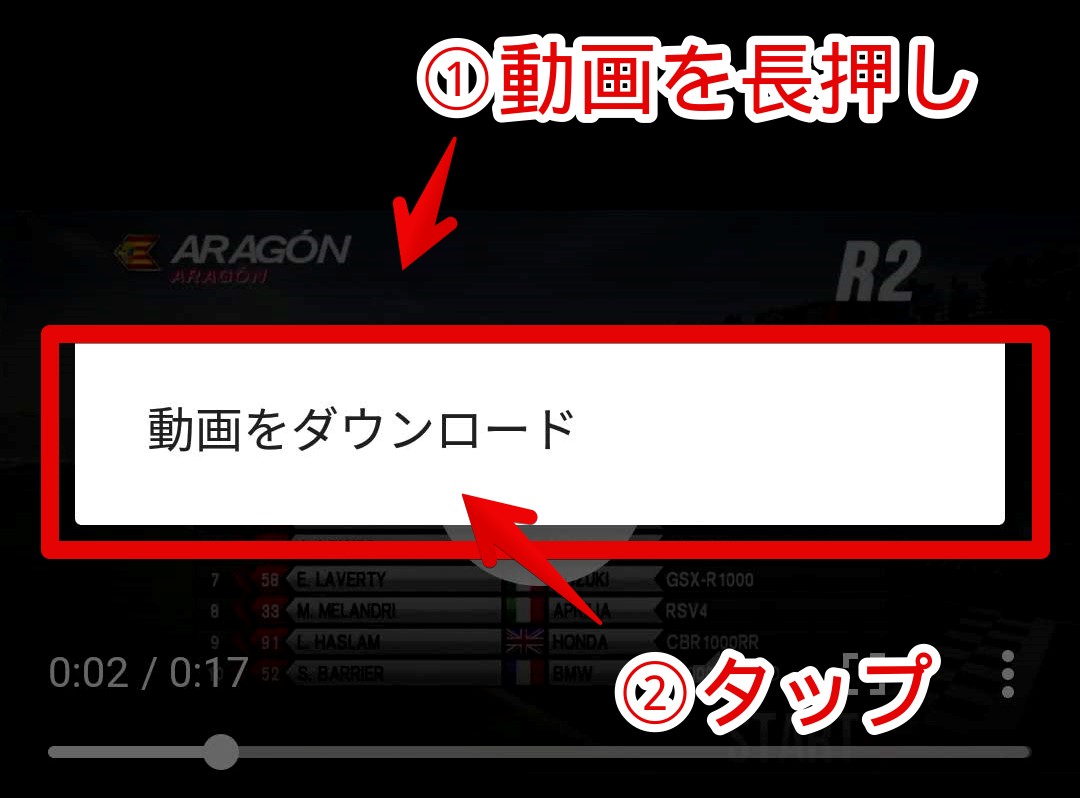 動画を長押しすると「動画をダウンロード」ボタンが表示され、タップでダウンロードが始まります。