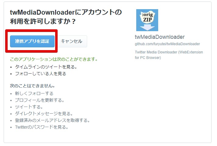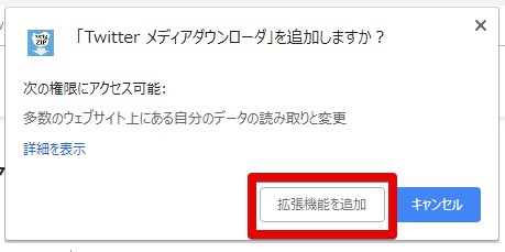 「Twitter メディアダウンローダ」の場合、「ウェブサイト上の自分のデータの読み取りと変更」にかかわる権限が与えられます。