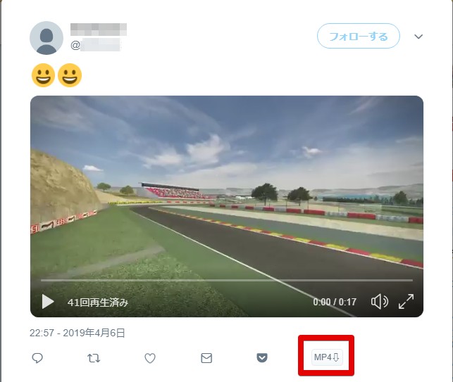 「Twitter メディアダウンローダ」を追加していると、ツイートや動画の下部に「MP4」ボタンが表示されます。クリックでダウンロードを開始してください。