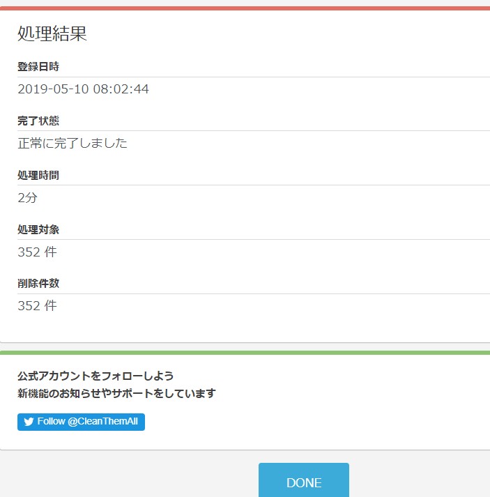 ツイートを削除すると、「完了!」が表示されます。「結果を見る」を選び、結果を確認しましょう。