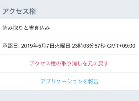 ツールの詳細画面では、各コンテンツにどういう権利が与えられているかを確認できます。今回は「読み取りと書き込み」のみですが、ツールやサービスによってはダイレクトメッセージが送れるもの、読み取りのみできるものに分かれます。