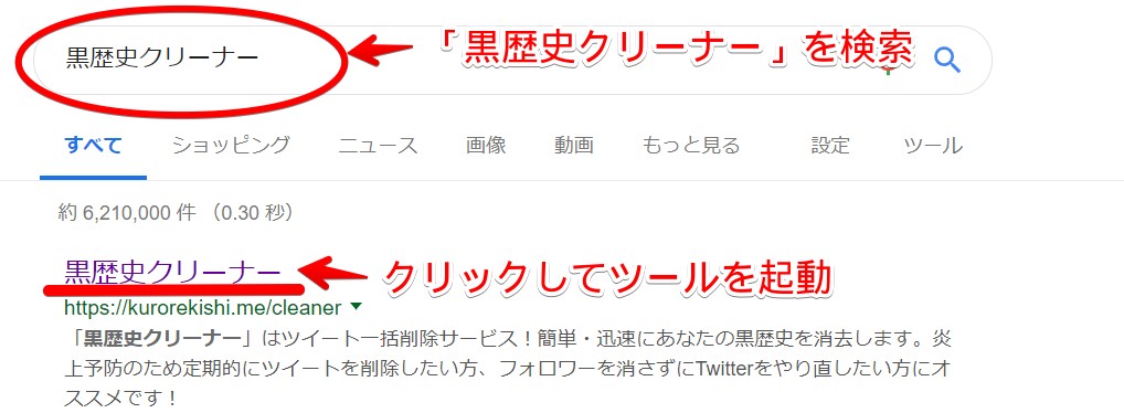 手順はスマートフォンと同様の流れで行います。まずはインターネットで「黒歴史クリーナー」を検索してツールを起動します。