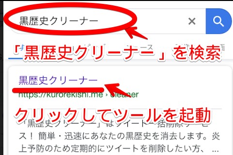 まずはインターネットの検索ブラウザから「黒歴史クリーナー」を検索します。1番上に表示されたサイトをタップして、ツールを起動しましょう。