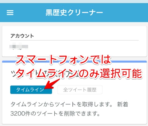 自分のアカウント名を確認したら、ツイートの取得方法を選択します。なおスマートフォンでは「タイムライン」のみ選択できる仕様です。タイムラインの新着から、3200件分の投稿を消せます。