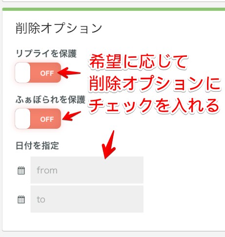 取得方法を選んだあとは、「削除オプション」から希望のオプションを付帯しましょう。「リプライを保護」「ふぁぼられを保護」「日付を指定」の3つから自由に設定できるため、保護しておきたいものや削除したい期間を選んでみてください。
