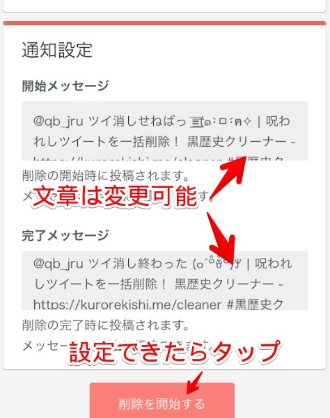 「通知設定」では本ツールを使う際に自動で投稿されるメッセージを設定できます。デフォルトメッセージでも、自分で編集してもOKなので、文章を確認しておきましょう。