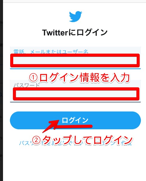 まずはブラウザからTwitterのページを開きます。電話、メール、ユーザー名のいずれかと、パスワードを入力します。