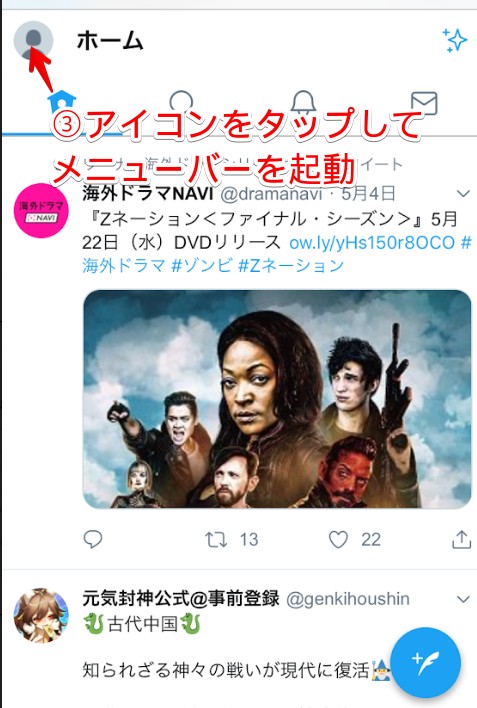 タイムラインの画面が表示されたら、自身のアイコンをタップしてメニューバーを起動します。