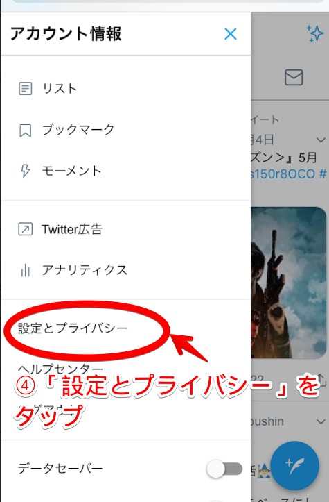 アカウント情報から「設定とプライバシー」を選択します。