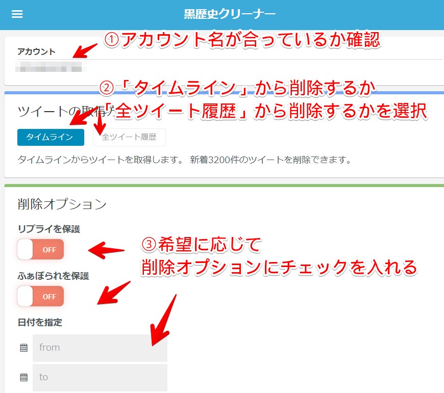「リプライを保護」「ふぁぼられを保護」はオン・オフを切り替えるのみ、日付指定は削除を希望する期間を入力するのみなので、簡単に利用できます。