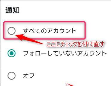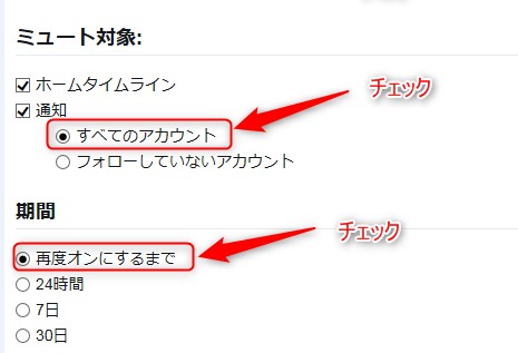 このとき、ミュート対象を「すべてのアカウント」に、期間を「再度オンにするまで」に設定し、タイムラインへの通知が再開しないようにしましょう。