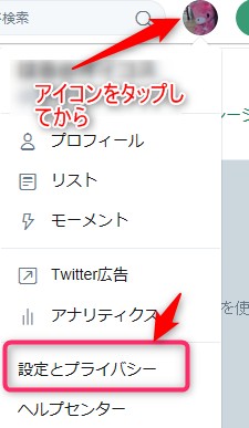 PCから設定を行う場合は、「Twitter」のホーム画面に表示されている自分のアイコンをタップして「設定とプライバシー」を開きます。
