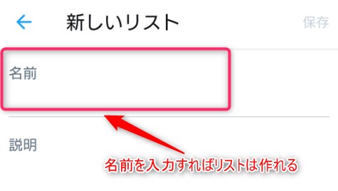 まとめたいユーザーに見合ったリスト名を入力し、保存をタップすれば完成です。