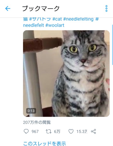 ホーム画面と同様、「ブックマーク」ページで保存したツイートが確認できました。このページでは「いいね」と同じように保存したツイートだけを一覧として見られます。誰のタイムラインにも通知を出さずに情報を管理できるので、「いいね」と同様に使えます。