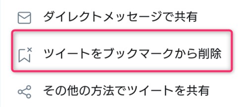 「ツイートをブックマークから削除」の表示を確認し、タップします。正しく削除されると、リストから外れてブックマーク画面には表示されなくなります。