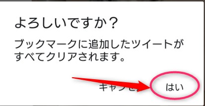 一括削除では「ブックマーク」に保存した全てのツイートが消えるので、確認画面が表示されます。本当に全てのブックマークを削除するのであれば、「はい」をタップすれば全ての情報が無くなります。