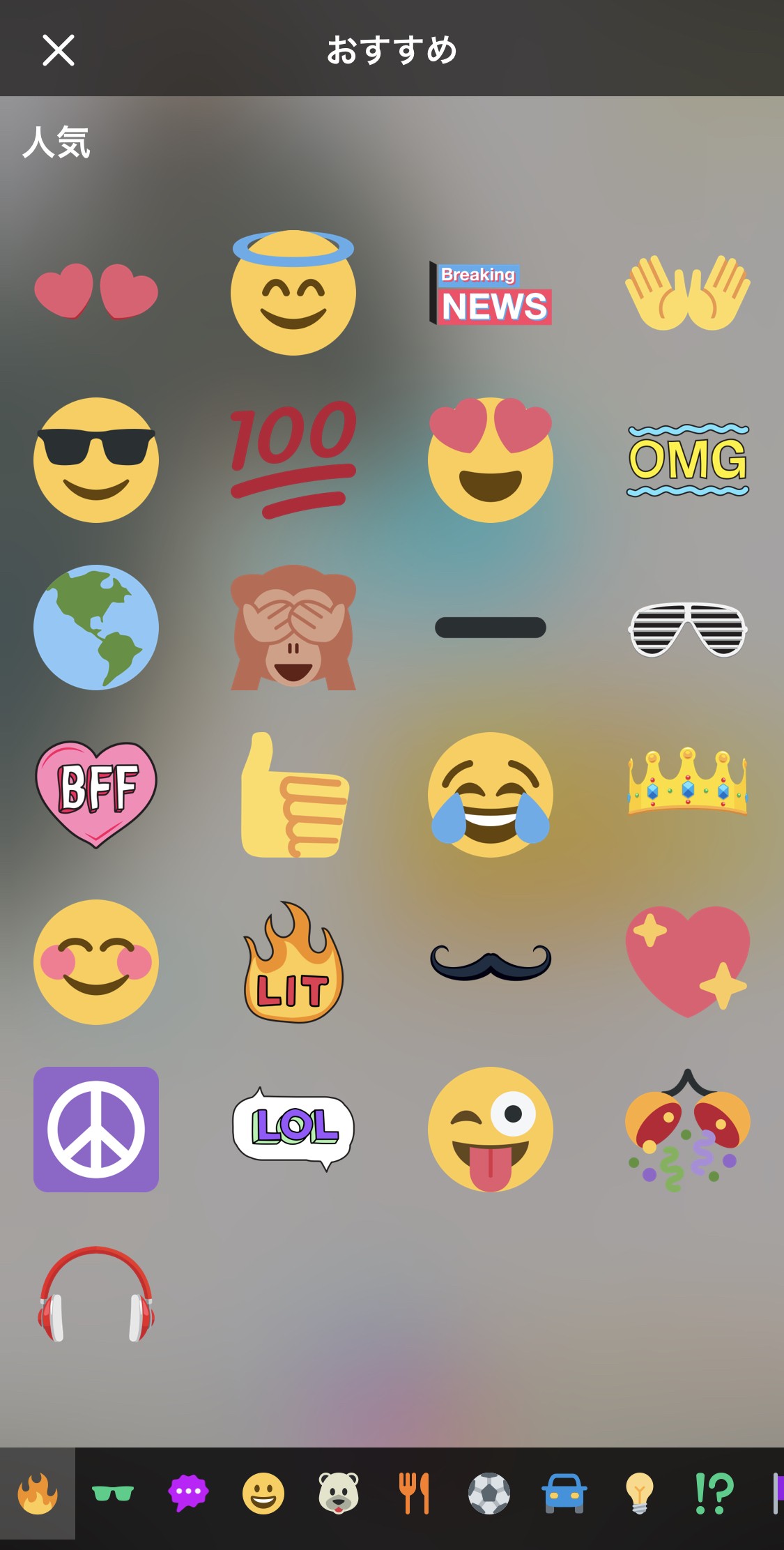 画面下メニューの1番左がスタンプボタンです。ここからは画像にスタンプを追加できます。ボタンをタップして表示されるスタンプ一覧から好きなものを選び、画像に適用しましょう。スタンプは画像をもっとデコレーションしたい時や、見せたくないものを隠す時にも便利です。