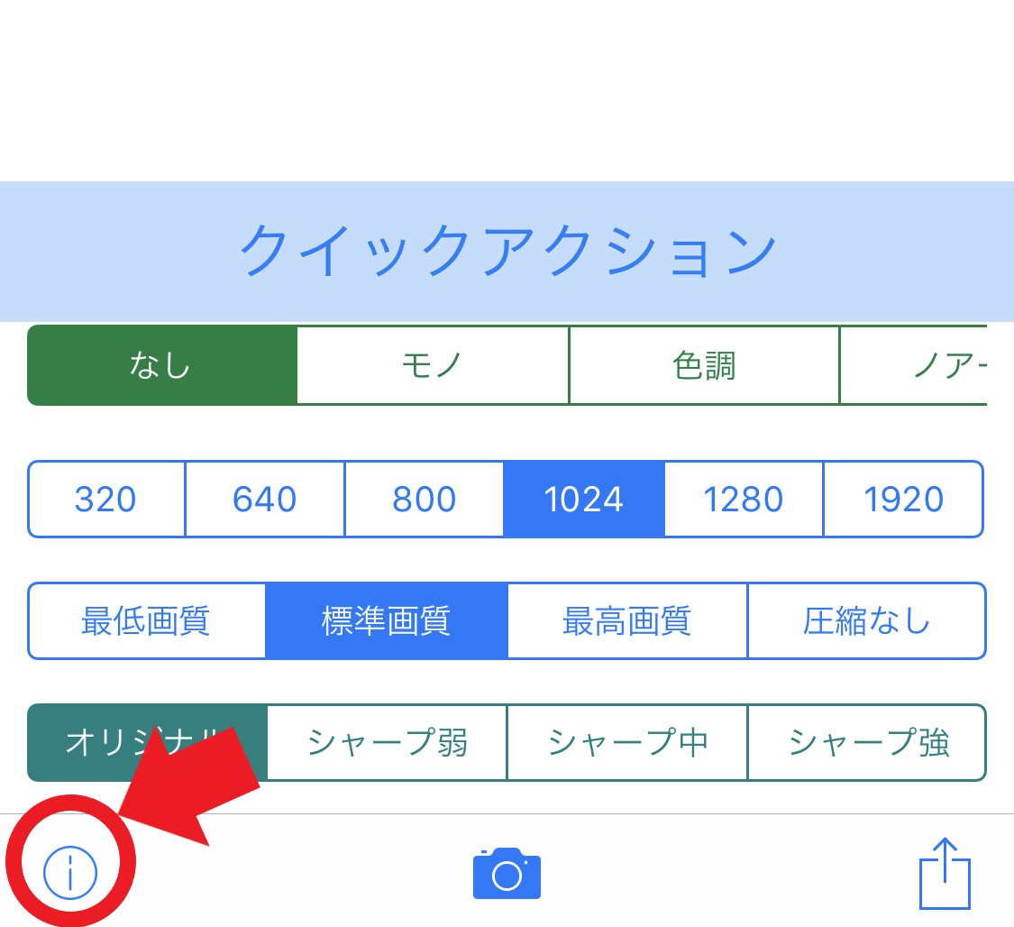 リサイズしたい画像を選んだら、編集画面に移動します。編集画面左下にあるインフォメーションマークをタップして、リサイズのための設定をしましょう。