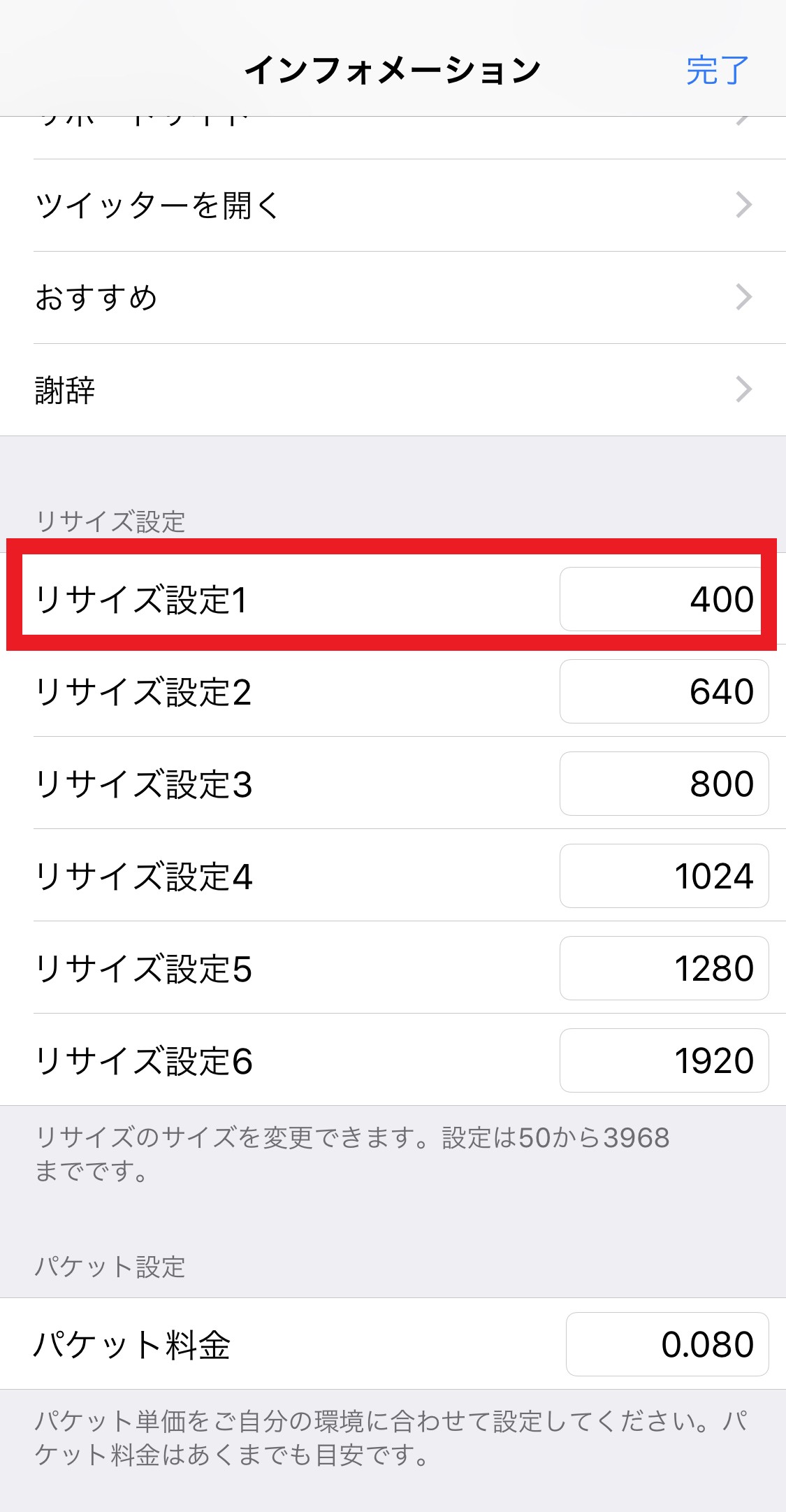 インフォメーションのボタンからはアプリの詳細設定ができます。この中から「リサイズ設定」を選び、Twitterアイコン用に「400ピクセル」を作ります。