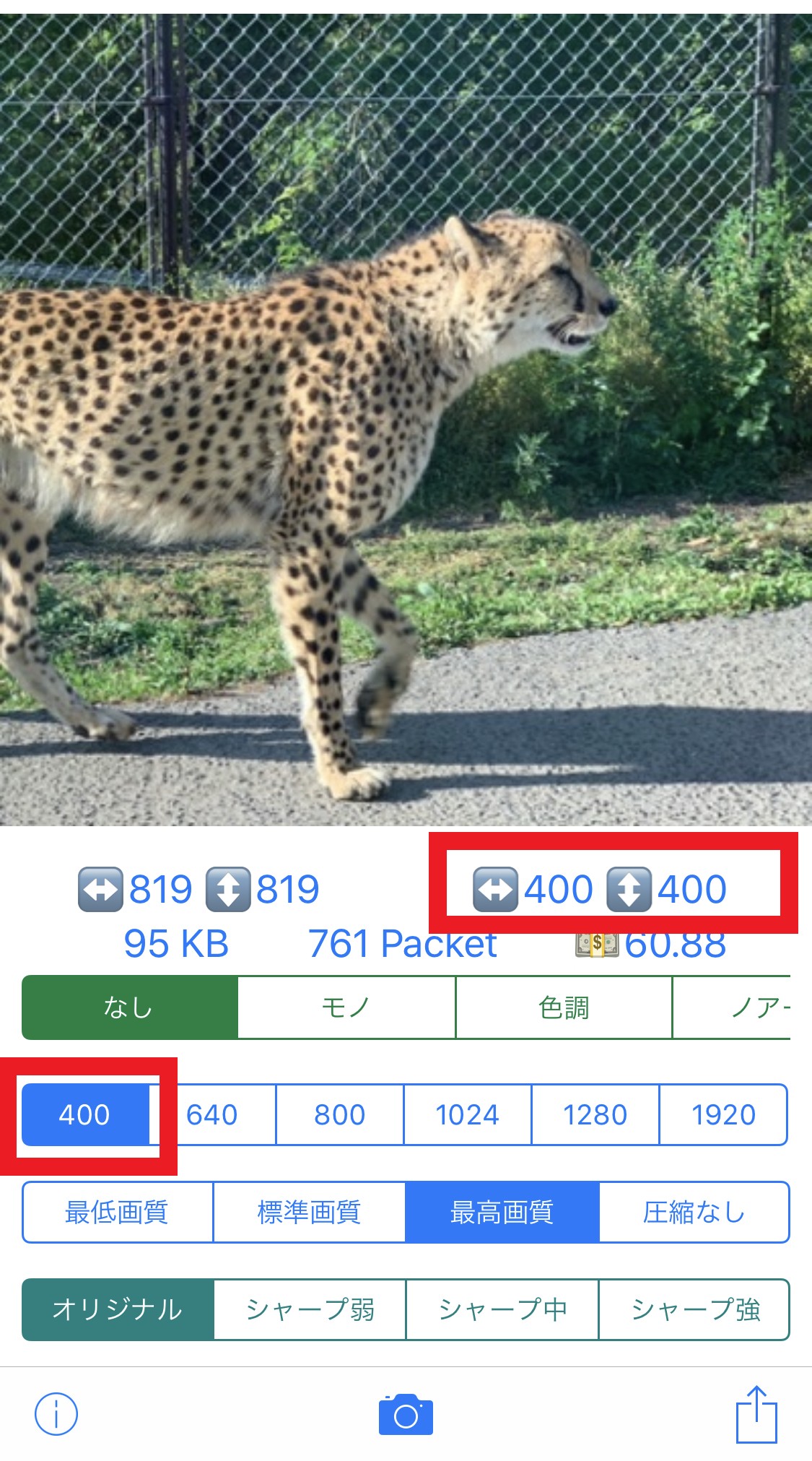 編集画面に戻り、リサイズのボタンをチェックしましょう。先ほど作った「400ピクセル」のボタンが表示されています。ボタンをタップしてリサイズを行いましょう。