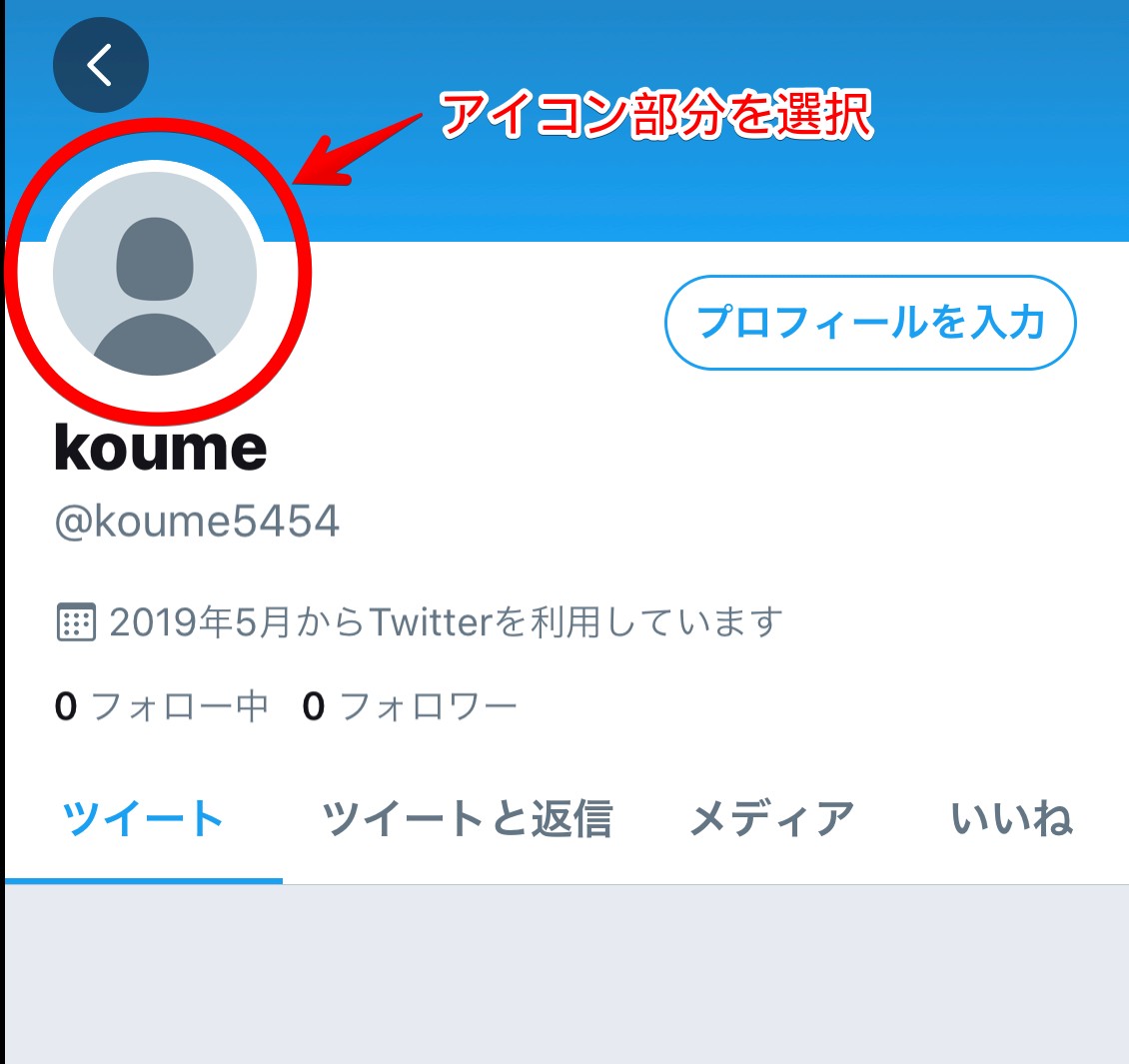 プロフィール画面を開いたら、画面左上に出てくるアイコン部分をタップします。すると、アイコンに使う画像の選択画面に移動します。