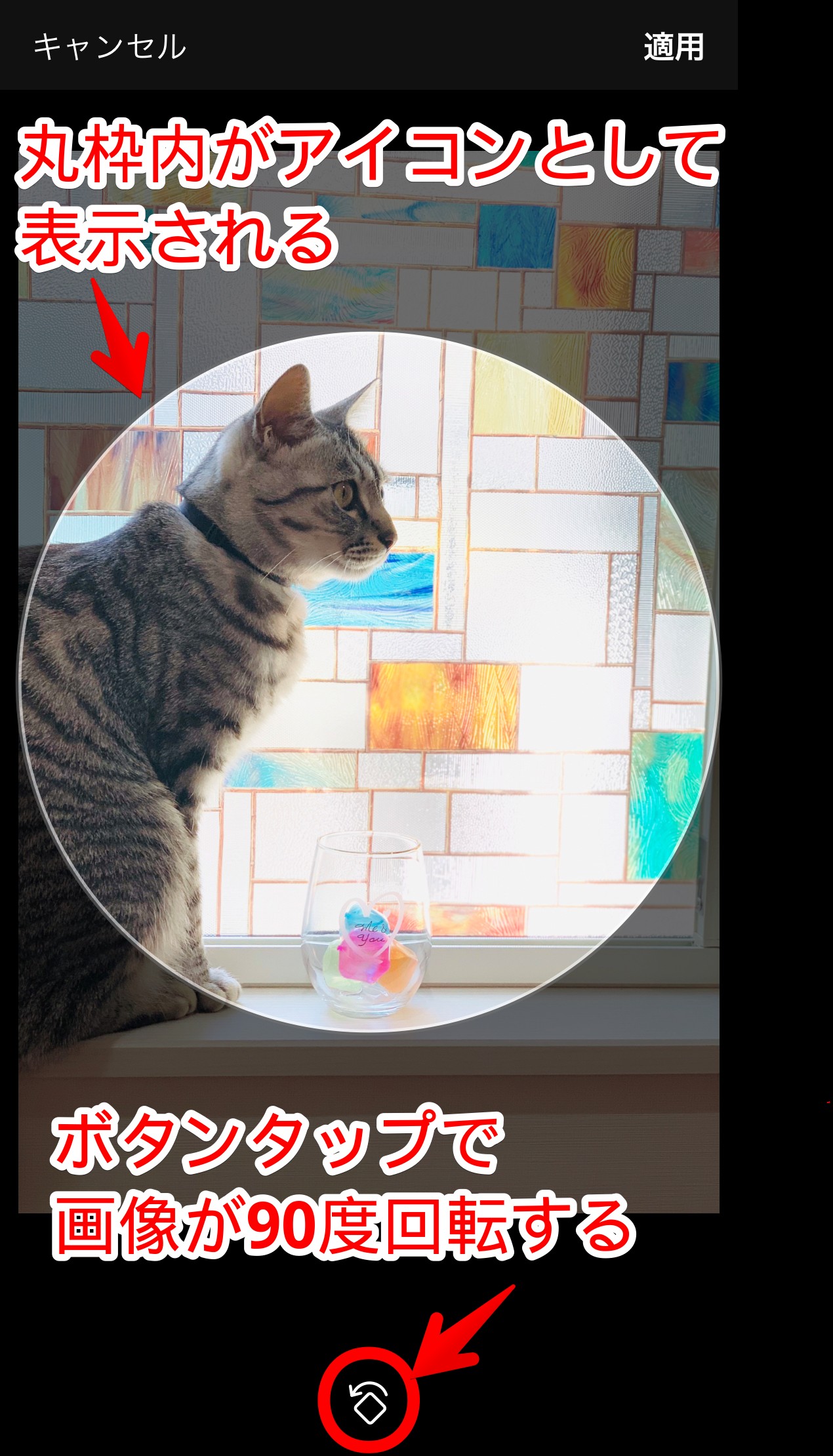 この画面では、ピンチイン・ピンチアウトして画像の拡大&縮小、画面下の回転マークを使って画像の回転ができます。トリミングと回転が終わったら、画面右上にある「適用」ボタンをタップします。