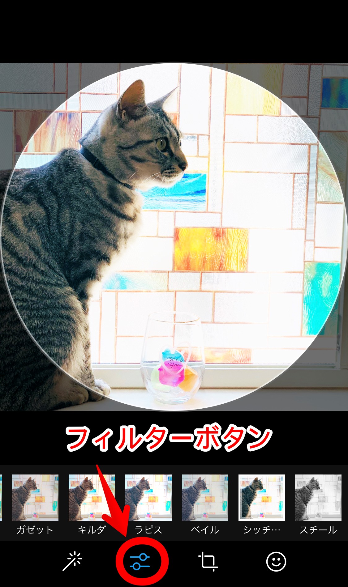 画面下メニューの左から2番目がフィルターボタンです。ここからは、画像に加工フィルターを適用できます。画面下に出てくるプリセットフィルターの中から、画像にぴったりのものを探しましょう。