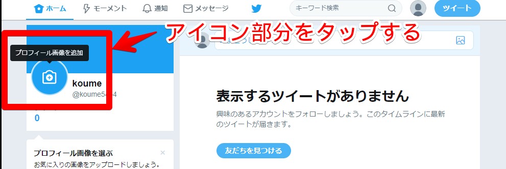 PC版のTwitterでは、ホーム画面左に常にプロフィールが表示されています。ユーザー名の横にあるアイコン部分にマウスを合わせ、「プロフィール画像を追加」というポップアップが出たら、アイコン部分をタップしましょう。
