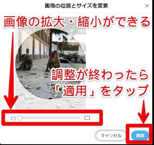 画像を選ぶと、画像の調整画面に移動します。ここでは、画像の位置やサイズの調整が可能です。スマホ版と同様に、画像の使いたい部分が丸い枠内に収まるように調整しましょう。画面下にあるバーをスライドさせると、画像の拡大&縮小ができます。