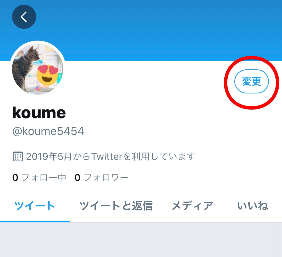 まず、先ほどと同様の手順でプロフィール画面を開きます。プロフィール画面を開くと、アイコンの右横に「変更」というボタンが表示されているので、選択します。