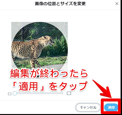 画像が決まると、トリミング画面に移動します。Twitterのアイコンは丸型のため、トリミング画面では丸い枠が表示されます。アイコンとして使いたい部分が丸い枠内に収まるように設置しましょう。