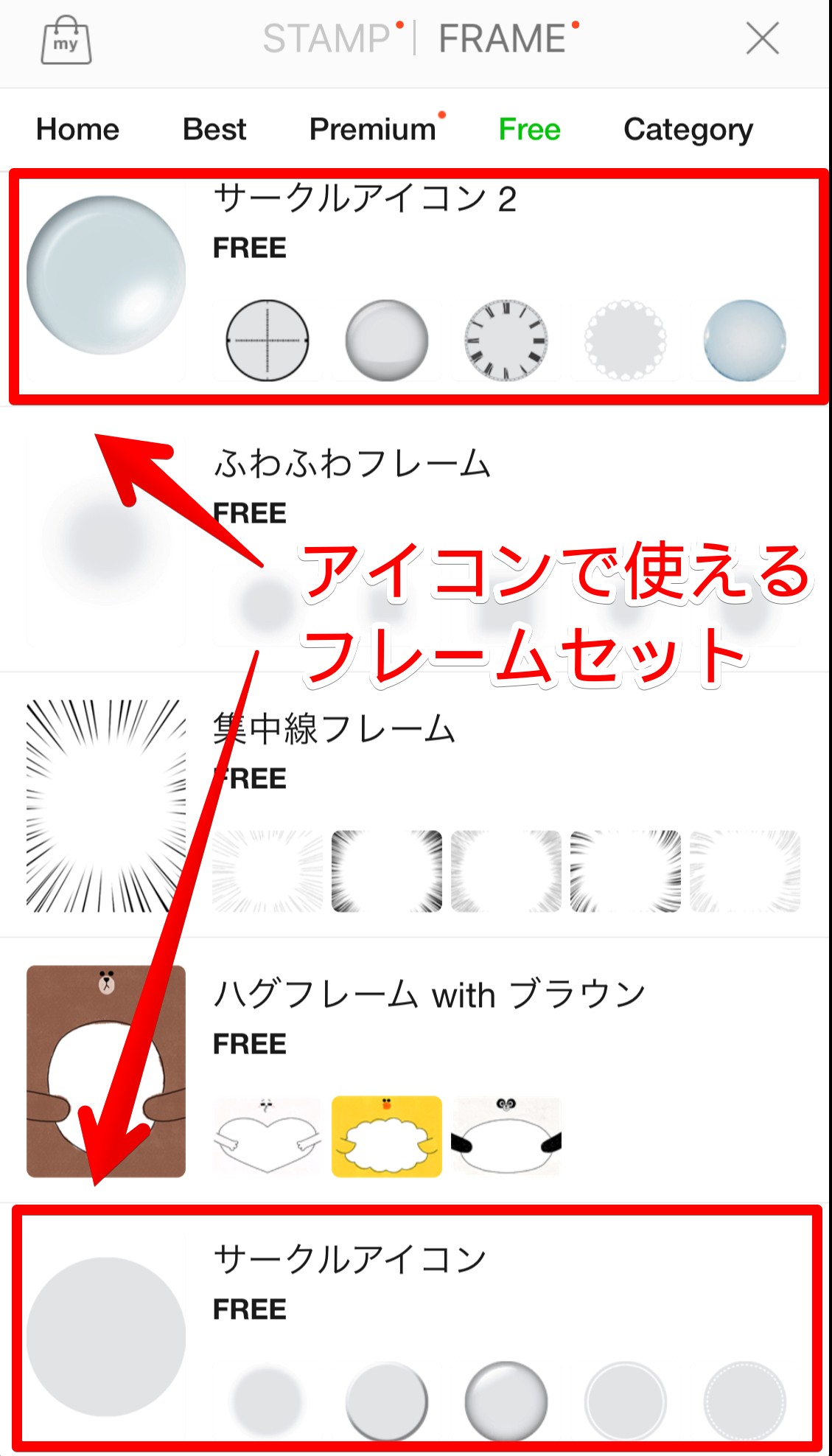 ショップ画面の1番上にある「FRAME」タブを開きます。「Free」と書かれた無料フレームの中から「サークルアイコン」または「サークルアイコン2」をダウンロードしましょう。