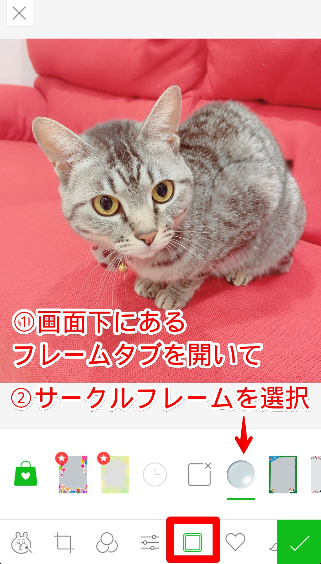 画像を選んだら編集画面に移動します。画面下にある四角ボタンがフレームタブです。フレームタブを開き、中からサークルフレームのタブを探して開きます。