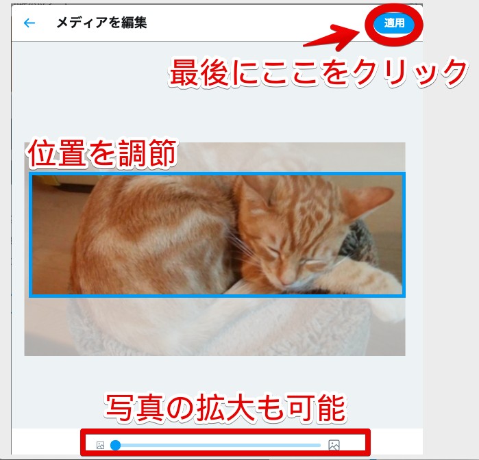画面下のゲージを使って、画像サイズの調節もできます。ゲージを右に伸ばすほど画像が拡大されていくので、必要に応じて利用してみてください。画像の調節が終わったら、画面右上の「適用」をクリックしましょう。