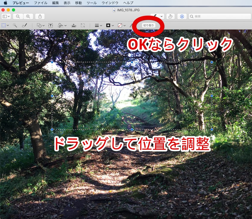 切り取りたい箇所をドラッグで選択すると、ツールバーに「切り取り」ボタンが追加されるので、変更がなければクリックしてください。