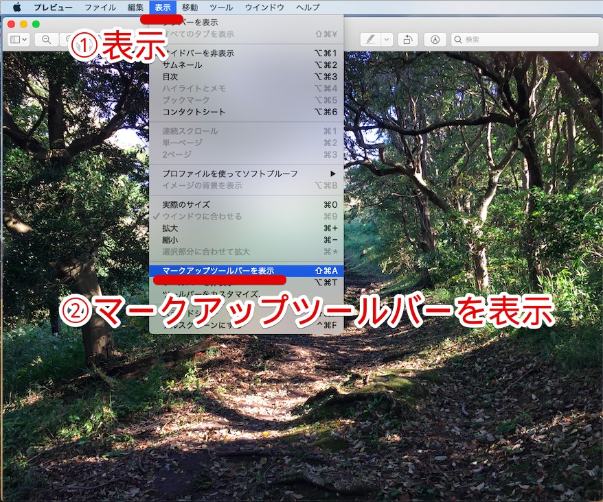 Macでトリミングをする場合は、まず「プレビュー」で使いたい画像を開きます。「表示」をクリックしてメニューを開いたら、続いて「マークアップツールバーを表示」を選択しましょう。