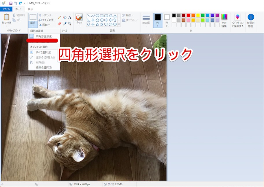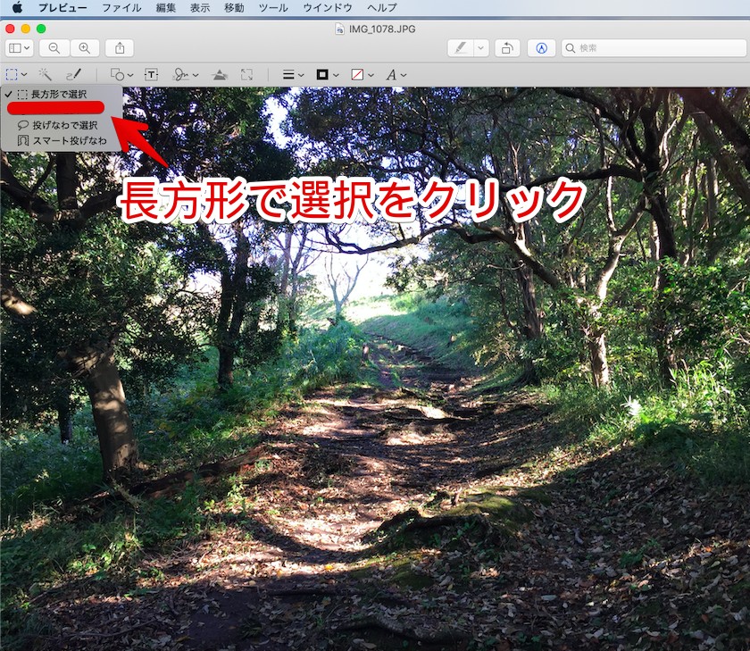 画面上部にツールバーが表示されたら、1番左にある選択ツールボタンをクリックしたあと、「長方形で選択」を選びます。