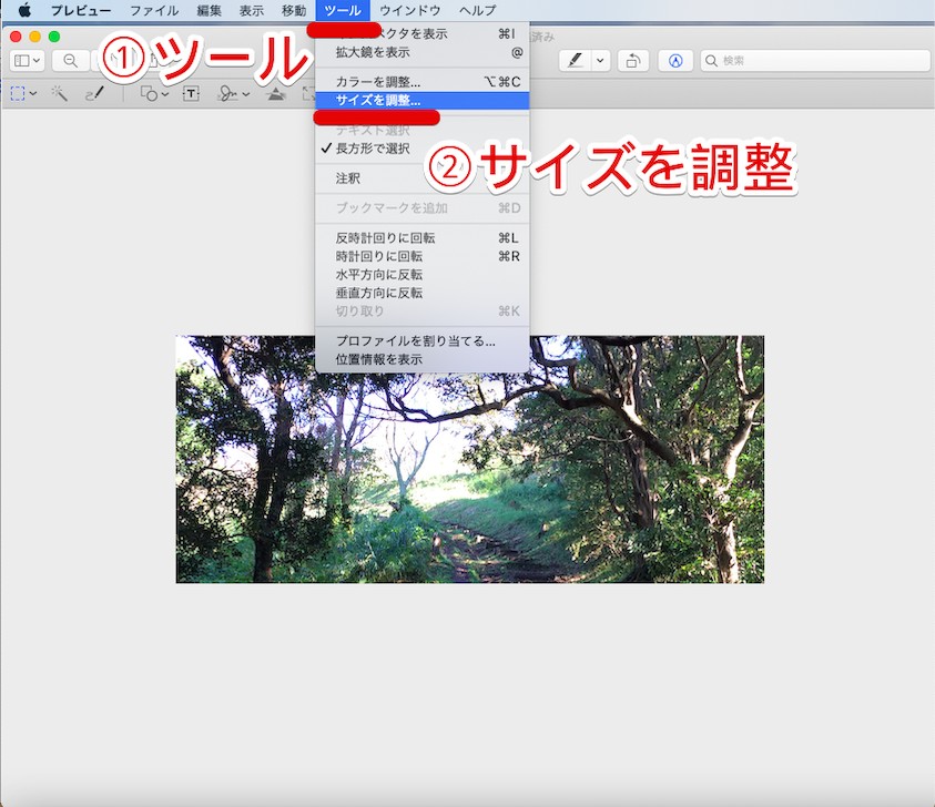 次に「ツール」のメニューを開き、「サイズを調整」を選択します。