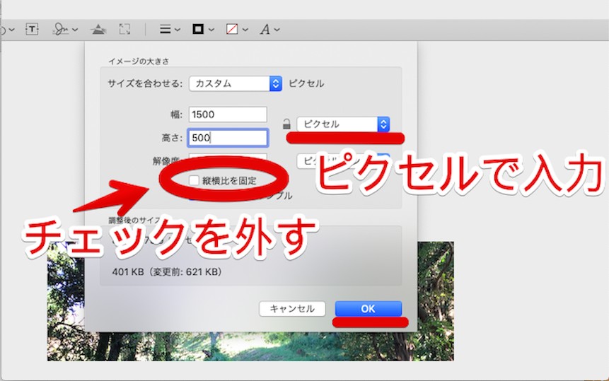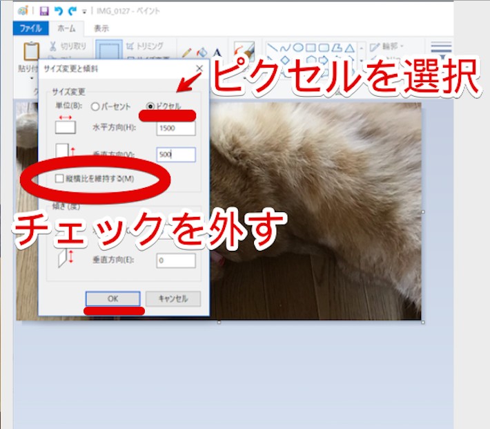 単位は「ピクセル」を選び、「縦横比を維持する」のチェックは外しておいてください。「水平方向:1500」「垂直方向:500」に設定したら、「OK」をクリックします。画像ができあがったら、「ファイル」タブから保存して完了です。