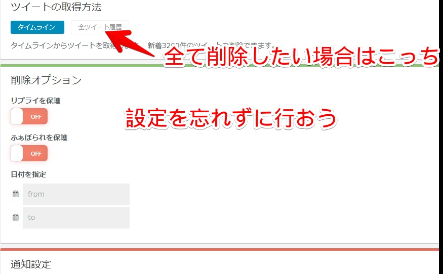「タイムライン」をクリックして取得した場合、最新の3,200件分しか削除できません。したがって、全てのTweetを削除したい場合は必ず「全ツイート履歴」から取得するようにしてください。ほかの項目は表示に従って適切に設定しましょう。