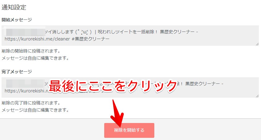 細かい設定が完了したら最後に下部にある「削除を開始する」ボタンをクリックしてください。これをクリックすると削除が開始されます。